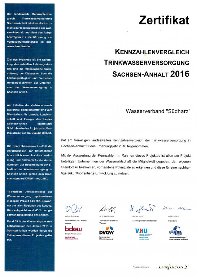 Der Wasserverband „Südharz“ hat am freiwilligen landesweiten Kennzahlenvergleich der Trinkwasserversorgung in Sachsen-Anhalt für das Erhebungsjahr 2016 teilgenommen.